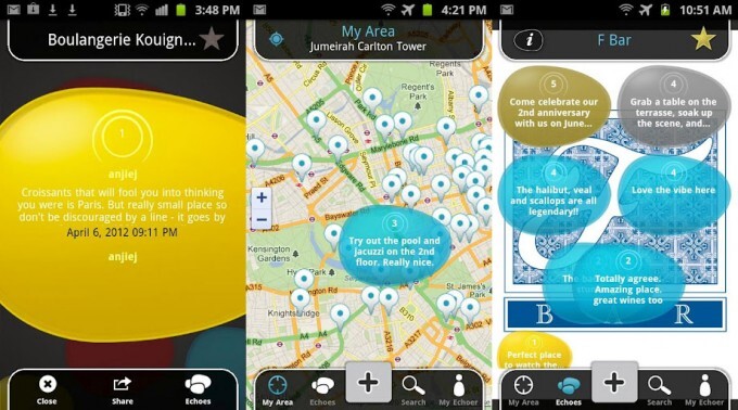 Echoer es un nuevo servicio que tras arrasar en iOS en sus primeros cuatro meses de vida, llega también a Android. Este servicio se basa en los pensamientos que tenemos cuando estamos en determinado lugar. Por ejemplo, estoy en un bar y tienen una oferta especial para el día de hoy que es bastante buena, puedo compartir un pensamiento sobre qué opino y la gente (sin preferencias de amigos) podrá ver ese pensamiento e informarse de lo que ocurre en ese local.