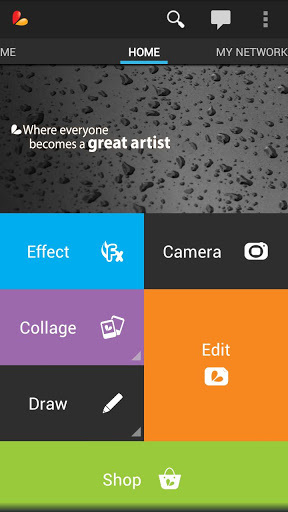 Al igual que en el caso de QuickPic,  PicsArt domina el equilibrio entre una interfaz clara y sencilla a la vez que cubre todo lo necesario. Para empezar se nos abre una pantalla más propia de Windows Phone que de interfaz Holo, pero que nos permite escoger si editar imágenes, aplicar efectos directamente, hacer un collage, fotos o dibujos. Esto no destacaría por si solo si no hablamos del contenido y de que pasa si desplazamos el dedo en esta pantalla.