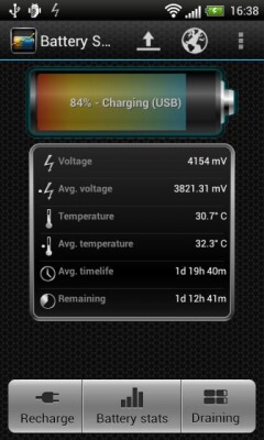 A la derecha del texto podéis ver una imagen del panel principal de Battery Stats Plus. Podremos tener controlado muchos aspectos de un solo vistazo: