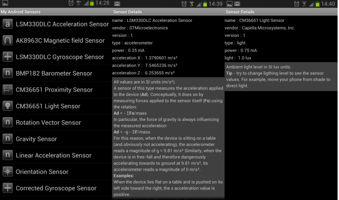 Esta app nos da una lectura de los sensores del terminal, esto significa: nombre del sensor, proveedor del sensor, tipo, potencia y lectura actual. La cosa no acaba ahí ya que el desarrollador nos ha añadido una descripción de cada tipo de sensor, exponiendo qué es, qué hace, cómo da las lecturas (explicando las unidades y su interpretación) e incluso qué lecturas son apropiadas.