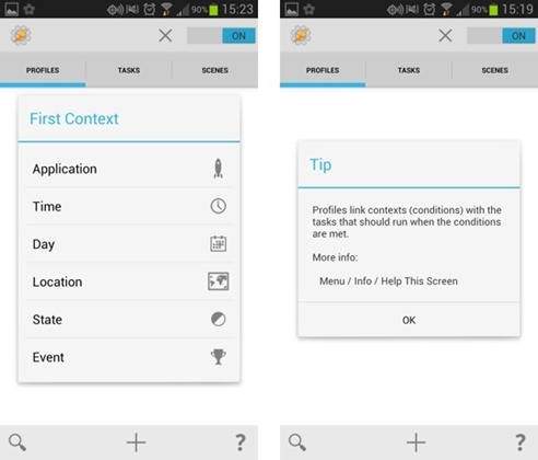 Hay muchas aplicaciones que hacen estas cosas, AutomateIt, Llama, Locale, SmartPlaces y muchas más. Pero la que ha sido siempre la más completa de todas ha sido Tasker: miles de combinaciones, cientos de acciones, muchísima personalización. El único problema que tiene es que tiene una interfaz gráfica horrible. No la cambian desde el año 2010, para que os hagáis una idea.