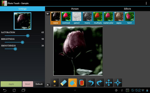 Disponemos de todos los filtros más populares, desde el blanco y negro de toda la vida hasta el desenfocado, sepia y todos esos típicos filtros. No te dejes engañar por la interfaz de la aplicación, que es algo «cutre». La aplicación funciona bien y nos puede sacar de un apaño de forma más que decente. Los efectos se ven muy bien y aunque como digo, la aplicación es algo limitada en cuanto a diseño, uno se hace con ella rápidamente.