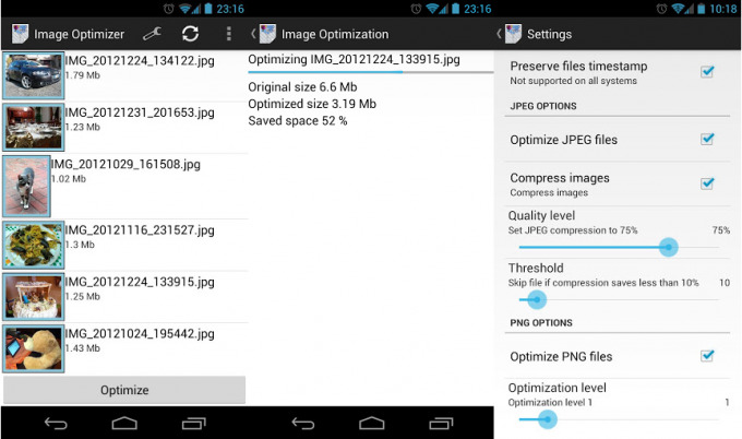 La aplicación cuenta con opciones: podemos elegir si aplicarlo sobre jpg, npg o ambos (nada que no sea uno de esos). También podemos escoger el porcentaje mínimo a reducir, de forma que si una imagen no se puede reducir ya no saldrá para seleccionarla. También podemos elegir si solo optimizamos la codificación JPG (mediante el árbol de Huffman) o comprimimos las imágenes, esta última opción ahorra aún más espacio, pero con una pérdida de calidad. Eso sí, podemos escoger el máximo de calidad que estamos dispuestos a perder, y las imágenes en PNG no tienen pérdida y las pérdida de JPG no son notables en el teléfono.