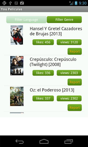 La aplicación en sí no tiene mucho misterio. La lista ya cuenta con una muy buena cantidad de películas, algunas muy recientes. Podremos elegir idioma de las películas entre inglés o español. Evidentemente podremos buscar títulos, pero también podremos filtrar por género si no tenemos ninguna en mente. Se pueden reportar enlaces por varios motivos y en teoría también marcar como favoritos, aunque no estoy seguro de que funcione del todo bien.
