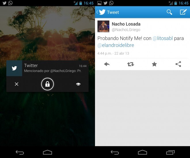 Como ejemplo que seguramente será de interés general por tratarse de Twitter, dejo a continuación una captura de pantalla de Notify Me! haciéndome saber que me ha llegado una mención y, a su derecha, la mención de Twitter abierta directamente desde Notify Me!
