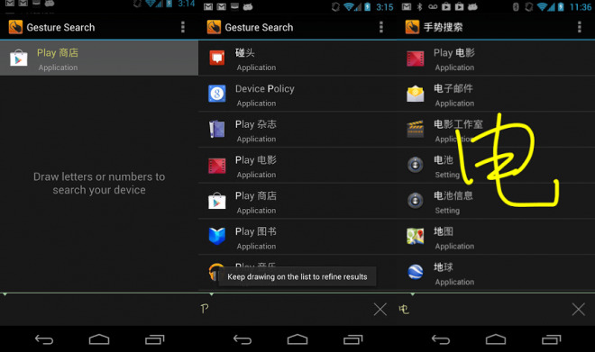 Ahora, Gesture Search, estará disponible para reconocer caracteres y palabras de más de 40 idiomas. Basta con dibujar un sólo símbolo para que te muestre los resultados concluyentes. Por si fuera poco, ahora se puede usar la transliteración. Esta característica, permite al usuario transcribir de un alfabeto a otro, por ejemplo, del occidental al árabe, chino, japonés o coreano.