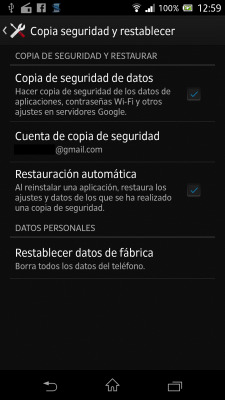 De este modo ya tendremos una copia de seguridad genérica sobre la configuración y ajustes en nuestro terminal pero no son datos personales tales como calendario, correo, contactos, marcadores del navegador, documentos, fotos, vídeos o información de personas.