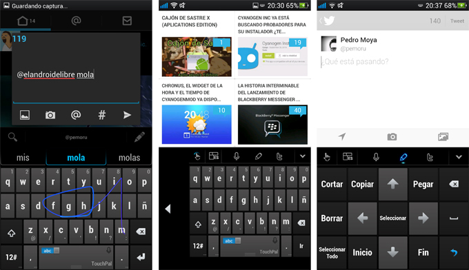 Se puede escribir en él mediante pulsaciones individuales de las letras o haciendo swipe sobre ellas, función que ellos llaman Curve y que ya hemos visto en otras ocasiones. Pero la tecnología que permite alcanzar una escritura veloz es TouchPal Wave y lo que hace es que mientras estamos escribiendo nos aparecerán en pequeño, bajo las letras, las posibles palabras que queramos decir y solo bastará con arrastrar dicha letra a la barra de espacio para completarla. Y no sólo eso, sino que podemos seguir escribiendo frases completas en cuestión de segundos y sin levantar el dedo de la pantalla mediante el mismo procedimiento. Podéis verlo en acción en el siguiente vídeo: