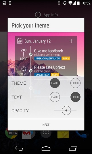 El procedimiento para usar UpNext es el mismo que con cualquier otro widget. Según el launcher que usemos, podemos mantener pulsado un escritorio o bien movernos por la lista de aplicaciones hasta llegar a los widgets. De cualquier manera encontraremos UpNext en dicha lista, y podremos seleccionarlo para empezar su proceso de configuración. Actualmente podremos elegir entre un tema claro u oscuro, y el texto blanco o negro, además de ajustar la opacidad.
