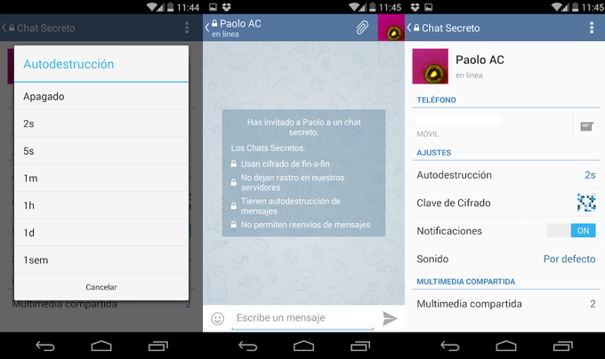 Telegram cuenta con la opción de crear chats secretos. Y no solo esto, si clickamos encima del avatar en la parte superior derecha accederemos a un menú opciones en el que podremos configurar el tiempo de autodestrucción de nuestros mensajes. Eso sí, tanto los nuestros como los de nuestro compañero, independientemente que uno lo active.