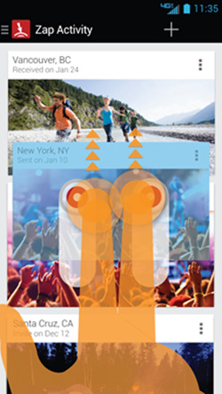 Para los que no conozcáis Droid Zap, funciona más o menos así: abrimos Droid Zapp y encontraremos una lista de nuestras fotos que tenemos almacenadas en el teléfono. Si pulsamos y arrastramos con dos dedos hacia arriba,  se crea una “zona virtual de compartición” alrededor de tu localización. Cualquiera que tenga instalada Droid Zapp y que esté dentro de este radio, podrá descargar la foto en su dispositivo sin más configuración que esa.