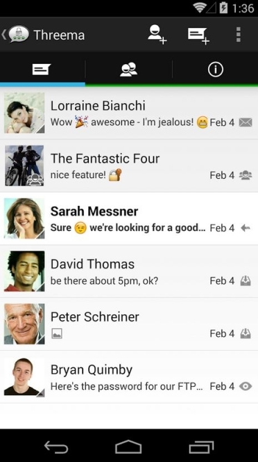 Threema es una aplicación de mensajería móvil que fija su obsesión en la seguridad. Provee encriptación real en el canal de comunicación extremo a extreno, de modo que sólo los destinatarios elegidos pueden leer los mensajes. Así lo detallan ellos en su misma web: