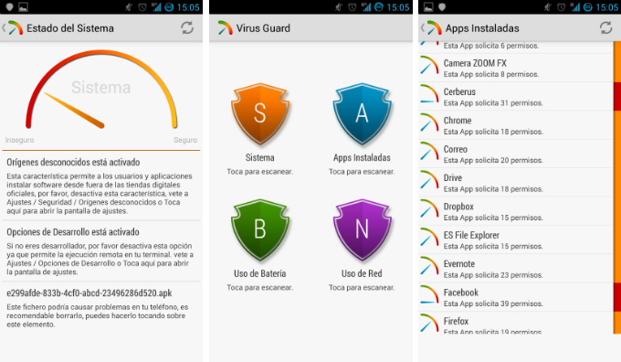 En esta herramienta encontramos cuatro funciones, por una parte el analizador del sistema, que realiza una búsqueda exhaustiva por todos los archivos y ajustes del teléfono. Al concluir esa búsqueda, muestra el estado del sistema, si es seguro o inseguro, así como las diferentes opciones y documentos que podemos borrar para aumentar esa seguridad. El análisis de aplicaciones instaladas funciona de manera similar, escaneandolas, mostrando su nivel de “peligrosidad” según el número de permisos que requieren y pudiendo desinstalarlas directamente si lo estimáis oportuno.