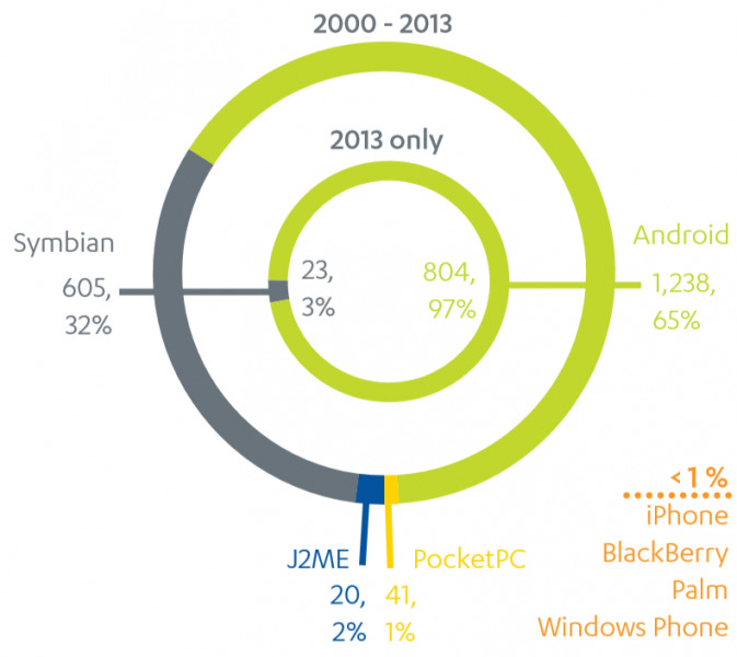 El gráfico es una evolución desde el año 2000 al 2013 y muestra claramente como en la actualidad, el 97% del malware pertenece a Android, mientras que tan solo el 3% pertenece a otros sistemas operativos (en concreto Symbian). Si nos fijamos, ni iOS ni Windows Phone tienen malware alguno. ¿Cómo es posible entonces que Google permite algo así?