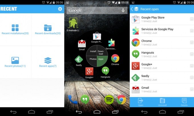 Al abrir RECENT nos encontramos con un menú muy clásico con cuatro apartados, uno de ellos para ver las últimas aplicaciones instaladas. Y finalmente también un sitio para ver las fotos de la galería divididas por el día de uso, con una interfaz sencilla pero limpia.