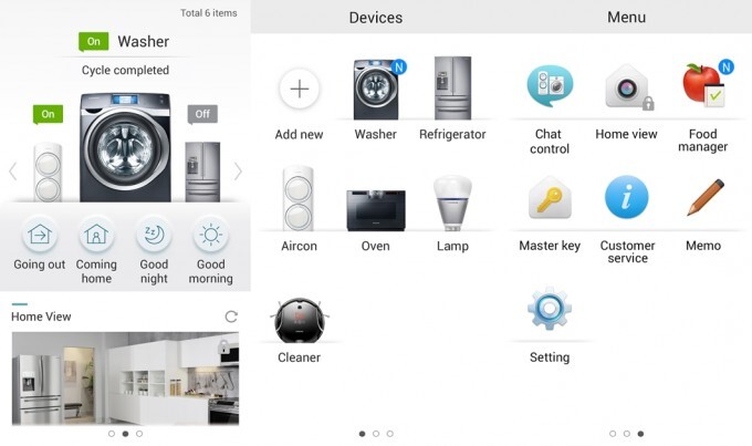 Con una interfaz muy limpia y clara como ya nos tienen acostumbrados, nos permite hablar con todos nuestros electrodomésticos marca Samsung que estén conectados al sistema. Y lo de hablar es literal, porque podremos saber el estado de todas las tareas automáticas al mas puro estilo chat preguntando a los electrodomésticos y que nos respondan, o que nos avisen en cuanto exista alguna novedad. Si os gustaría controlar las cosas de un modo mas clásico, podemos usar los clásicos interruptores para controlar a placer su funcionamiento. Y si ninguna de estas cosas os valen, también podemos notificar al sistema cuando nos vamos de casa, cuando volvemos, o cuando entramos y salimos de la cama.