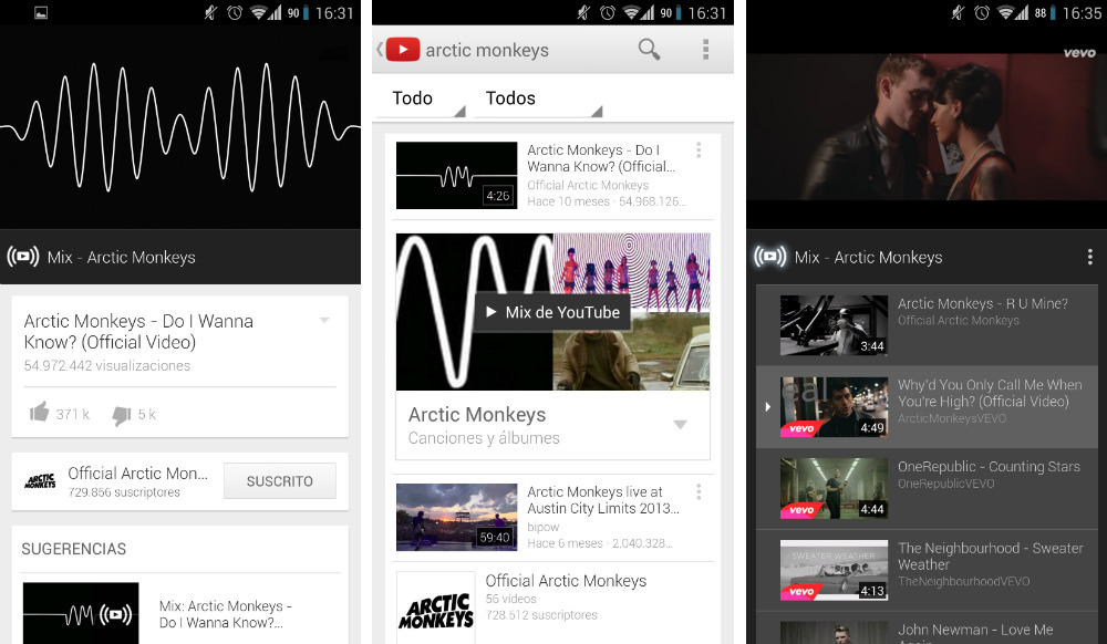Si lo comprobáis, podéis buscar un artista en vuestro Android, en nuestro caso Arctic Monkeys, automáticamente nos salen los resultados para esa búsqueda pero en primer lugar vemos el apartado Mix de Youtube. Al pulsar sobre esta mezcla comenzará a sonar una lista de reproducción con vídeos y canciones, la mayoría procedentes de los canales de VEVO, de ese cantante y otros grupos similares.