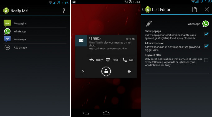 Desde la propia aplicación podemos configurar qué aplicaciones queremos que Notify Me! v2 tenga en cuenta, pudiendo elegir sólo algunas de las instaladas en nuestro teléfono y personalizando el comportamiento de las notificaciones o eligiendo que se muestren sólo aquellas que contengan determinadas palabras clave.