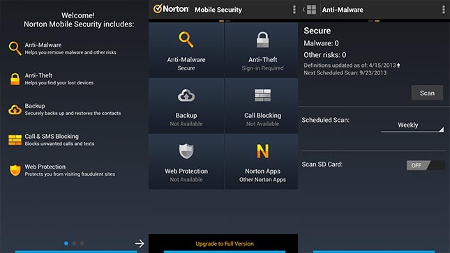 Norton es, sin lugar a dudas, una marca de confianza en la seguridad. Disponemos de una versión gratuita (con cierta protección periférica, como escaneo de la tarjeta SD), así como una subscripción de 29.99 dólares al año (con todas las características, incluido el bloqueo de teléfono a través de SMS en caso de pérdida o robo, no disponible en su versión gratuita).