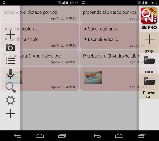 QwickNote se caracteriza por tener una interfaz basada en gestos que va más allá de lo que hayamos visto hasta ahora: deslizando hacia la derecha podremos crear cualquier tipo de nota que se nos ocurra, mientras que al contrario podremos clarificarlo todo en carpetas con diferentes nombres. Si deslizamos hacia la izquierda en una nota se elimina, mientras que si lo hacemos para la derecha se abre las opciones de cada nota.