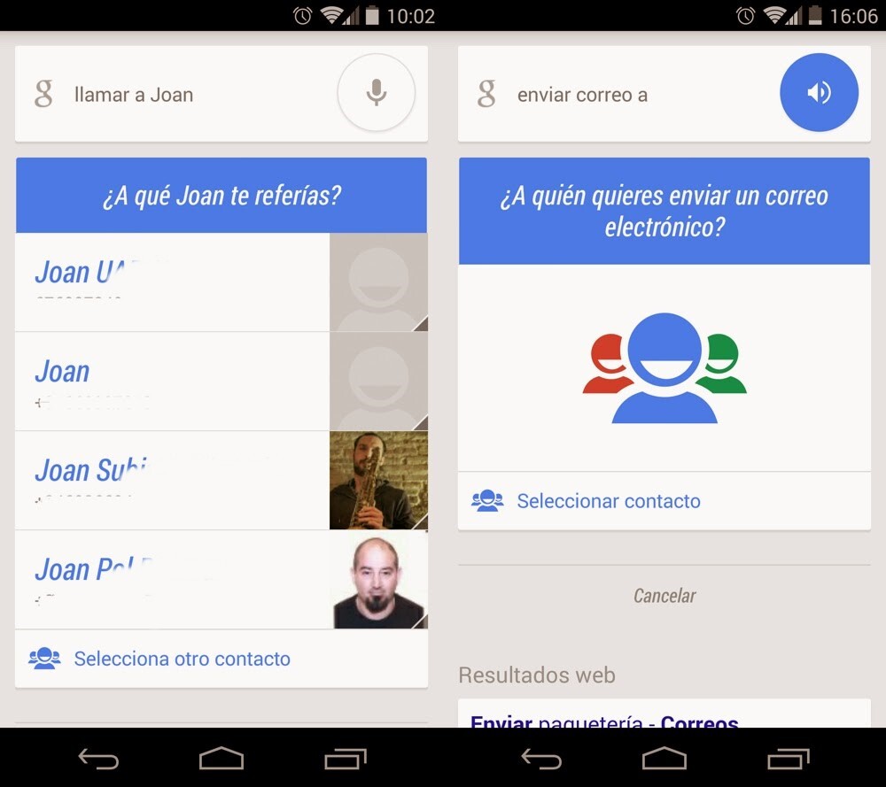La novedad es bastante sencilla de probar: sólo tenemos que, por ejemplo, dar a Google Now una orden que implique varias posibilidades. Por ejemplo, si tenemos varios contactos bajo el nombre de «Patricia» o «Joan», ahora nos preguntará por voz a cual queremos llamar, y a qué número de teléfono hacerlo en el caso de que tengamos más de uno apuntado en el contacto, pregunta que podremos contestar por voz.