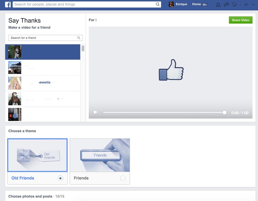 El funcionamiento es muy sencillo, y simplemente nos dirigiremos a la url facebook.com/thanks. Aquí escogeremos un tema y un contacto, y Facebook nos hará una selección de fotos y las irá adornando con mensajes un tanto azucarados: «Gracias por tu amistad», «por los recuerdos que hemos vivido», «por lo que hemos compartido juntos»….