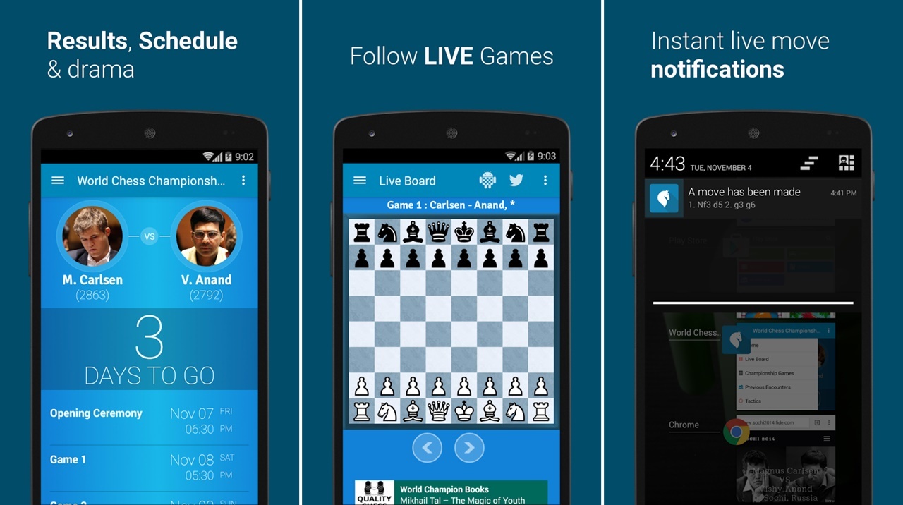 Y, probablemente, algunos de vosotros estéis interesados en saber cómo termina este encuentro durante los días que se disputa este campeonato mundial, ya seáis profesionales del ajedrez o aficionados que juegan por la diversión. Tenéis suerte, porque ya tenemos aplicación Android oficial para seguir el torneo en tiempo real, incluso teniendo el tablero de juego en nuestra pantalla.