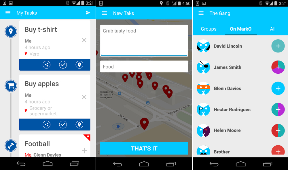 Ahora llega a Android MarkO, un gestor de tareas un tanto diferente que tratará de recordarte la tarea pendiente justo en el momento en el que la necesitas. Para ello, MarkO hace uso de nuestra ubicación, detectando dónde nos encontramos y recordando lo que tenemos que hacer en ese lugar. Así, si por ejemplo anotas «comprar manzanas», también podrás añadir un lugar específico donde comprarlas. La próxima vez que pases cerca, te avisará.