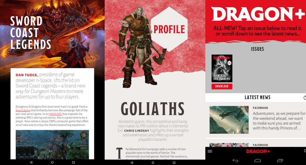 Desde 2007 se publica únicamente en Internet. Estos días Wizards of the Coast ha decidido ir un paso más allá. Llega Dragon+, la aplicación desde la cual podremos tener todas las noticias de D&D y descargarnos gratuitamente el número mensual de la revista. La aplicación está disponible para Android y tiene muy buena pinta, se nota claramente como la compañía lleva apostando por el contenido digital desde hace años.