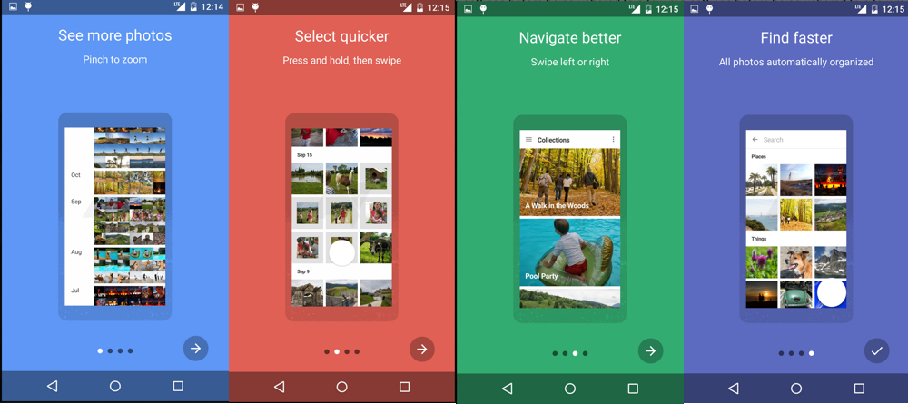 Al iniciar la aplicación seremos recibidos con la animación que ilustra el principio de este artículo. Después veremos la ya clásica explicación de cómo funciona la aplicación. Una vez pasado este tutorial ya nos encontramos con la propia aplicación en sí. Según las imágenes la aplicación de Fotos será Material Design en su forma más clásica. Menú lateral, animaciones, botón flotante..