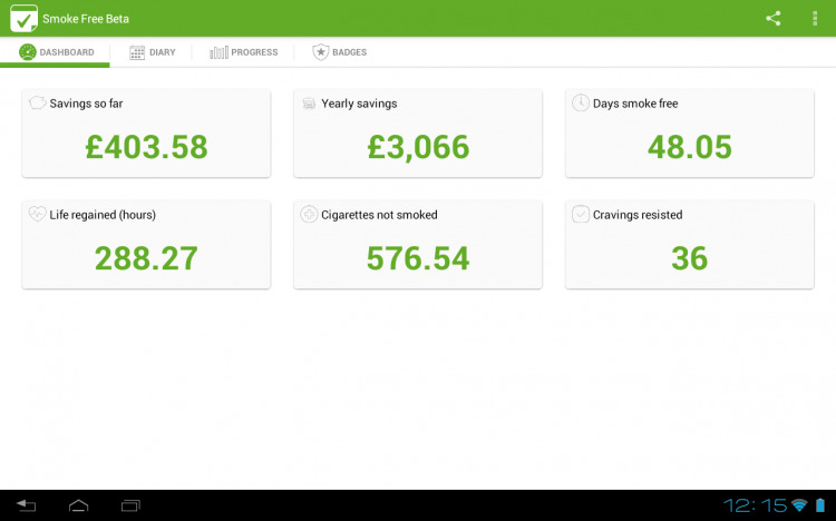 Aquí tendremos toda la información sobre la ‘gesta’ de dejar de fumar en una especie de pizarra que nos muestra información que motiva a seguir. Veremos cuanto hemos ahorrado hasta el momento y cuanto ahorraríamos al año, días sin fumar, horas de vida ganadas, cigarros que no te has fumado y cigarros a los que te ha entrado el ‘mono’ y has resistido.