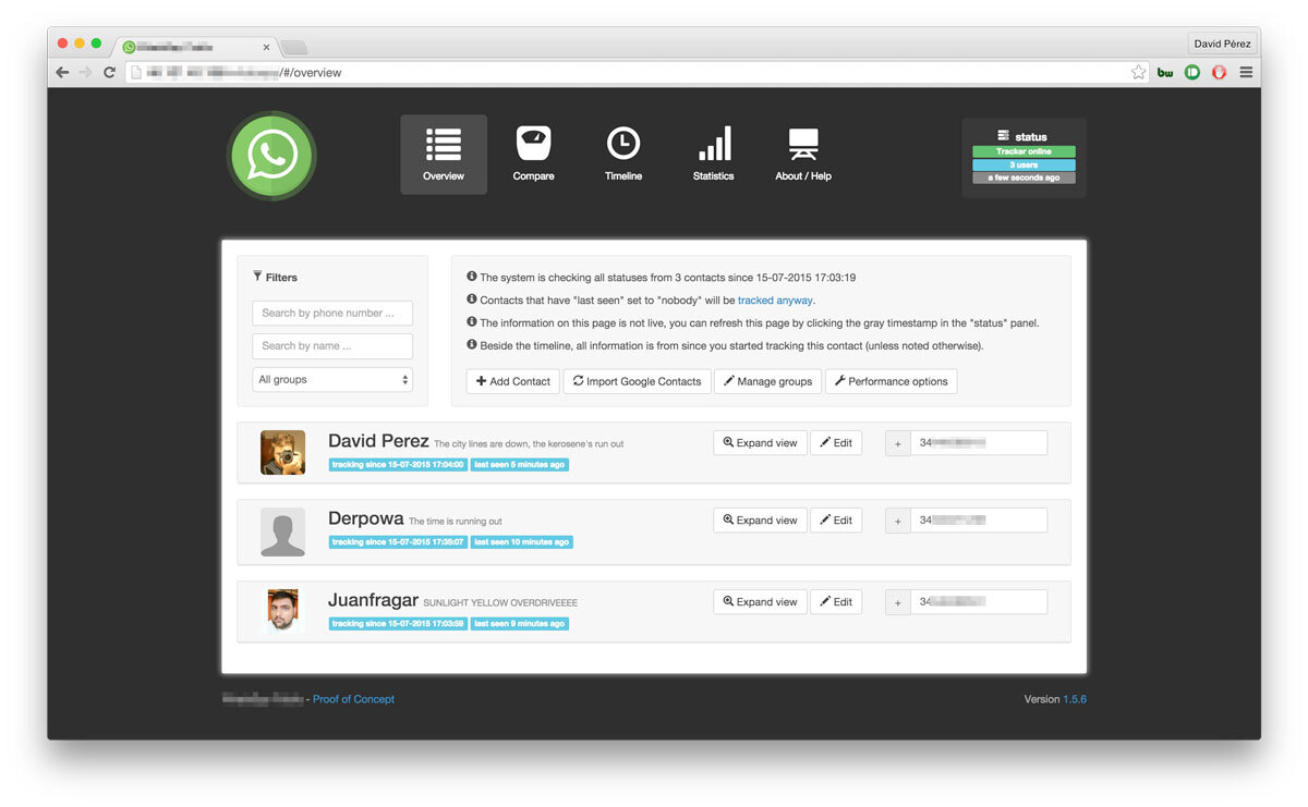 Una vez hemos terminado de configurarlo todo, y hemos introducido los teléfonos, todo comienza a funcionar automáticamente. Podemos ver de un vistazo todos los usuarios que tenemos controlados, utilizar los filtros para encontrar un número en concreto, y comprobar si todo está en orden.