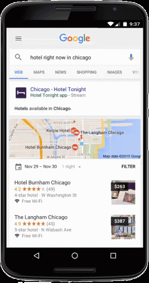 De este modo, Google anuncia que su motor de búsqueda a partir de ahora será no solo capaz de encontrar contenido que se encuentre en la web, sino que podrá «leer» información de las aplicaciones. Un ejemplo podría ser la búsqueda de un hotel, que en lugar de buscarnos la información en páginas web, reciba la información directamente desde alguna aplicación de hoteles que tengamos instalada.