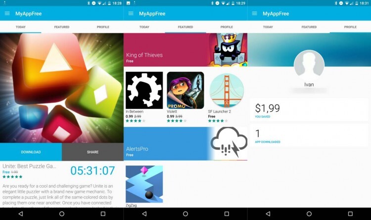 Al entrar en MyAppFree, nos encontraremos con tres pestañas. En la primera de ellas podremos ver la aplicación gratuita del día, la cual cambia al día siguiente, mientras que en la segunda podemos ver las ofertas más destacadas. Por último, también disponemos de un resumen de cuantas aplicaciones hemos descargado y cuanto dinero nos hemos ahorrado.