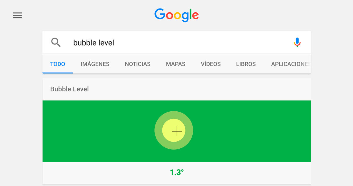 Si cumplimos con estas condiciones, es muy sencillo activar el nivel de burbuja, sólo tenemos que escribir o decir en voz alta ‘bubble level’. Cuando se termine la búsqueda, además de contarnos cuál es su definición exacta y proponernos aplicaciones, nos mostrará un nivel de burbuja completamente funcional.