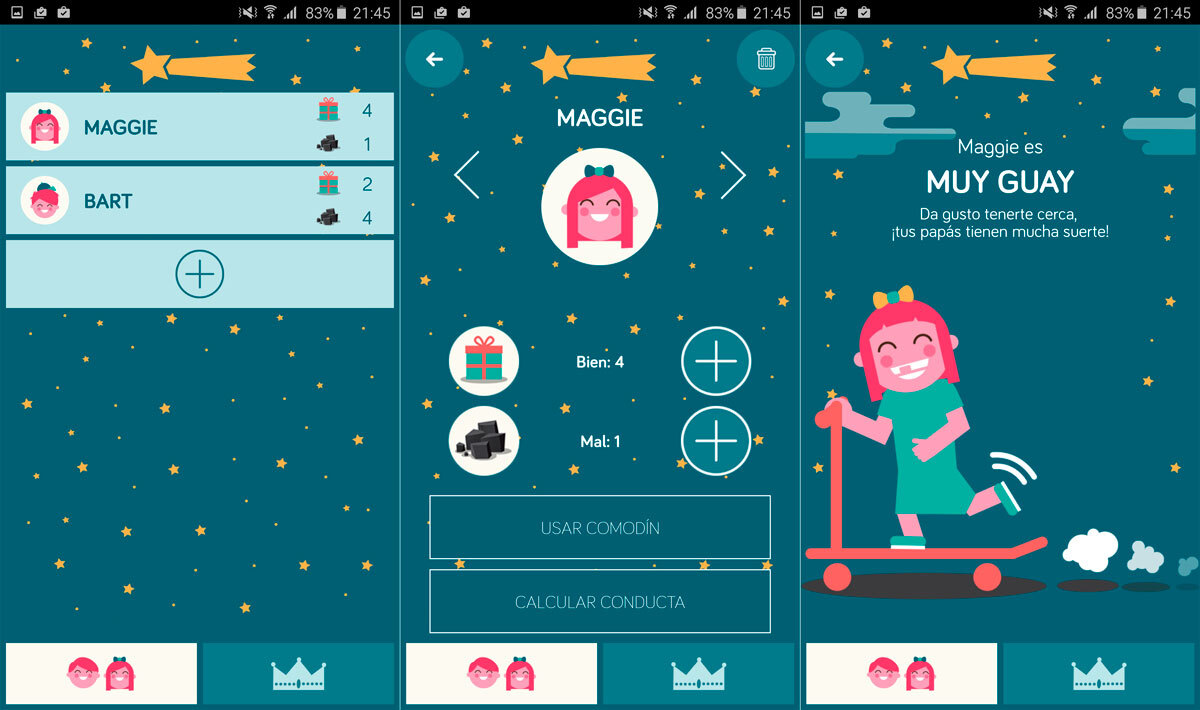 El funcionamiento de la aplicación es muy simple: tenemos un contador por cada hijo, donde podemos añadir tanto acciones buenas como acciones malas. En cualquier momento podemos calcular la conducta de cada uno, e incluso concederles un ‘comodín’ con el que poner los contadores del perfil a cero.