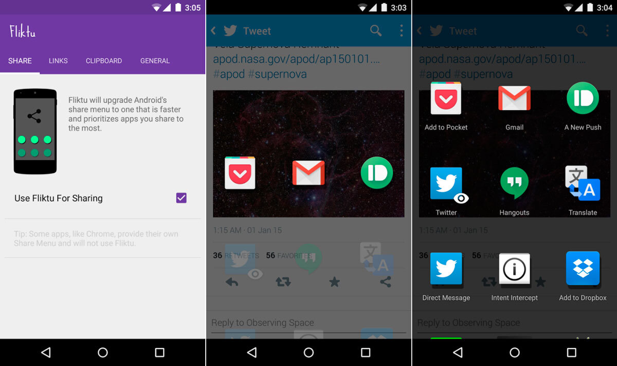 El menú de Compartir puede dejar mucho que desear en ocasiones. Compartir cualquier cosa es fácil con Fliktu para Android. Incluso con un gesto de la muñeca