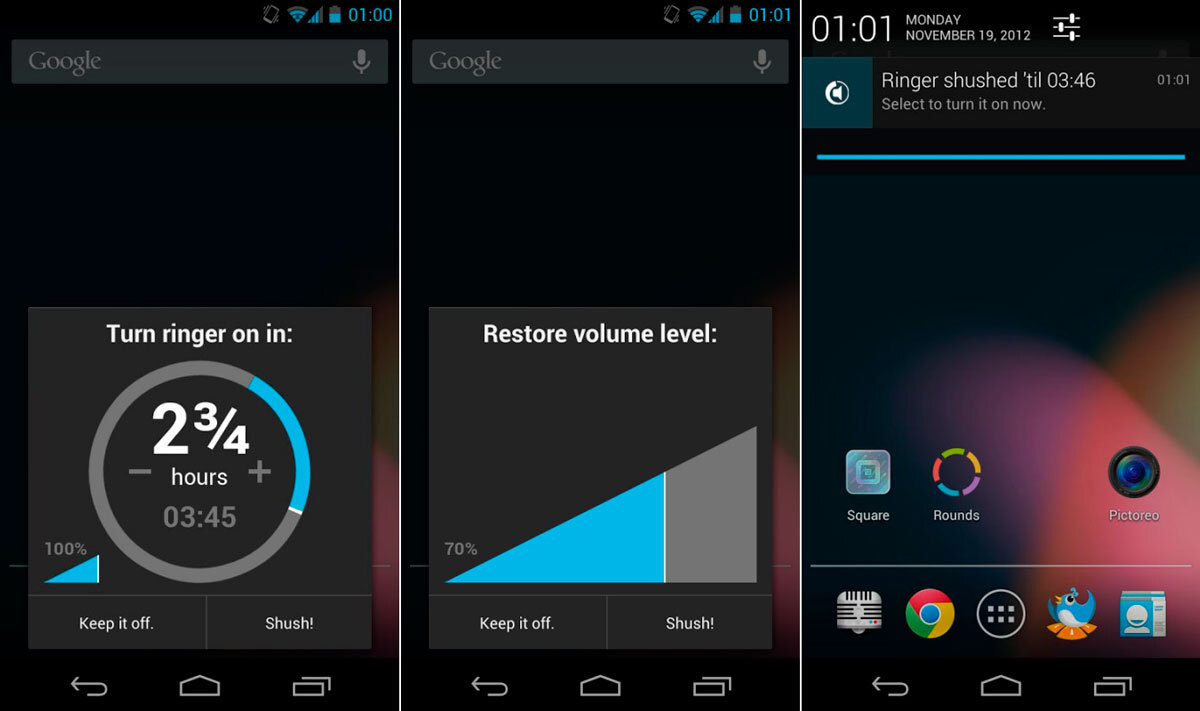 La aplicación tiene un funcionamiento bastante sencillo, y no tenemos que cambiar nuestras rutinas. Al bajar el volumen como siempre lo hacemos, aparecerá una nueva pantalla que nos dejará escoger cuánto tiempo queremos que dure el modo silencio, e incluso nos dejará seleccionar qué volumen queremos recuperar cuando esto ocurra.