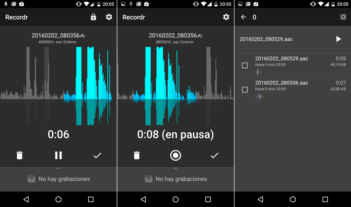 Recordr graba de una forma muy visual porque, aunque no estemos grabando, nos muestra un gráfico de sonido constante que representa el sonido que capta. Podemos grabar, poner en pausa, o detener la grabación cuando nosotros queramos, además de bloquear la pantalla o acceder a las grabaciones que ya hemos hecho.