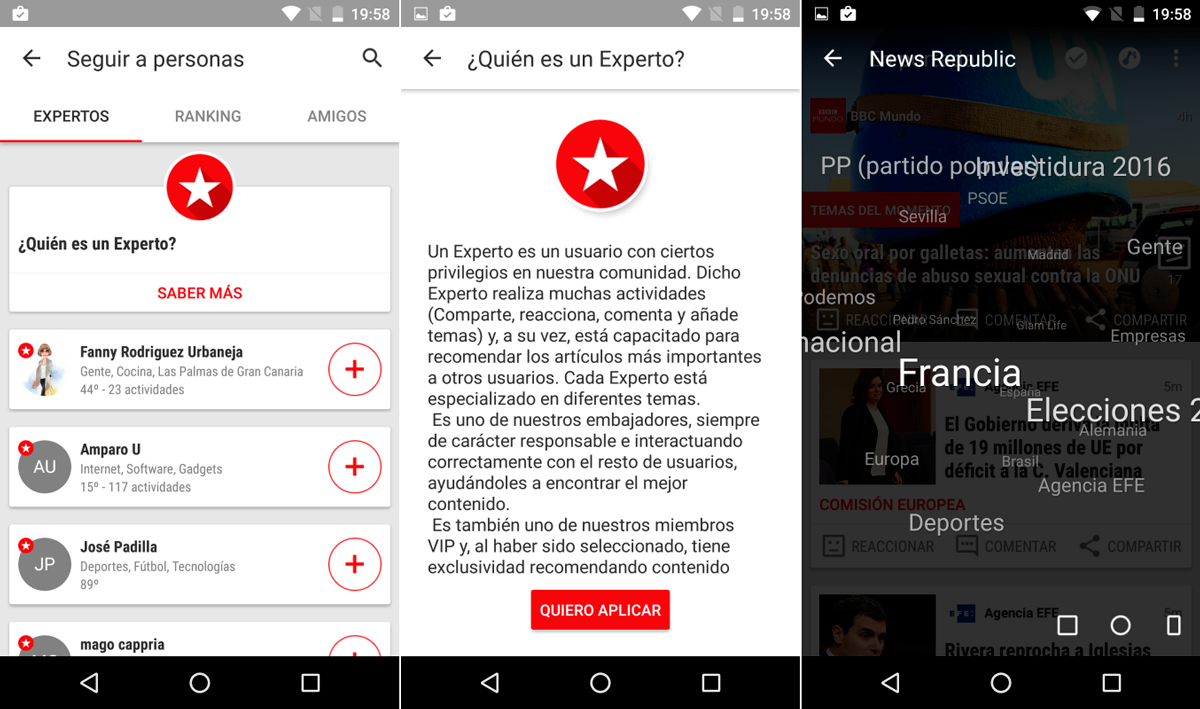 Con este movimiento, News Republic trata de tener más de red social, hacernos más sociales a través de las noticias que leemos. Podemos seguir leyendo las noticias que sólo queramos leer, los temas que nos interesen, pero ahora podemos complementarlo con los expertos que queramos seguir, reaccionar a las noticias con cinco valoraciones, o compartir los temas a través de otras redes sociales.