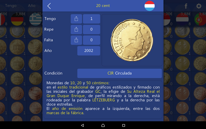 Dicha ventana ofrece información sobre el origen de la moneda (indicando también si es conmemorativa). En la parte superior de la ventana es posible marcar si ya se ha coleccionado la moneda en cuestión, si se tiene repetida o si es una moneda que todavía falta por incorporarse a la colección. Debajo de estos tres apartados, lo que aparece es la fecha de la moneda.