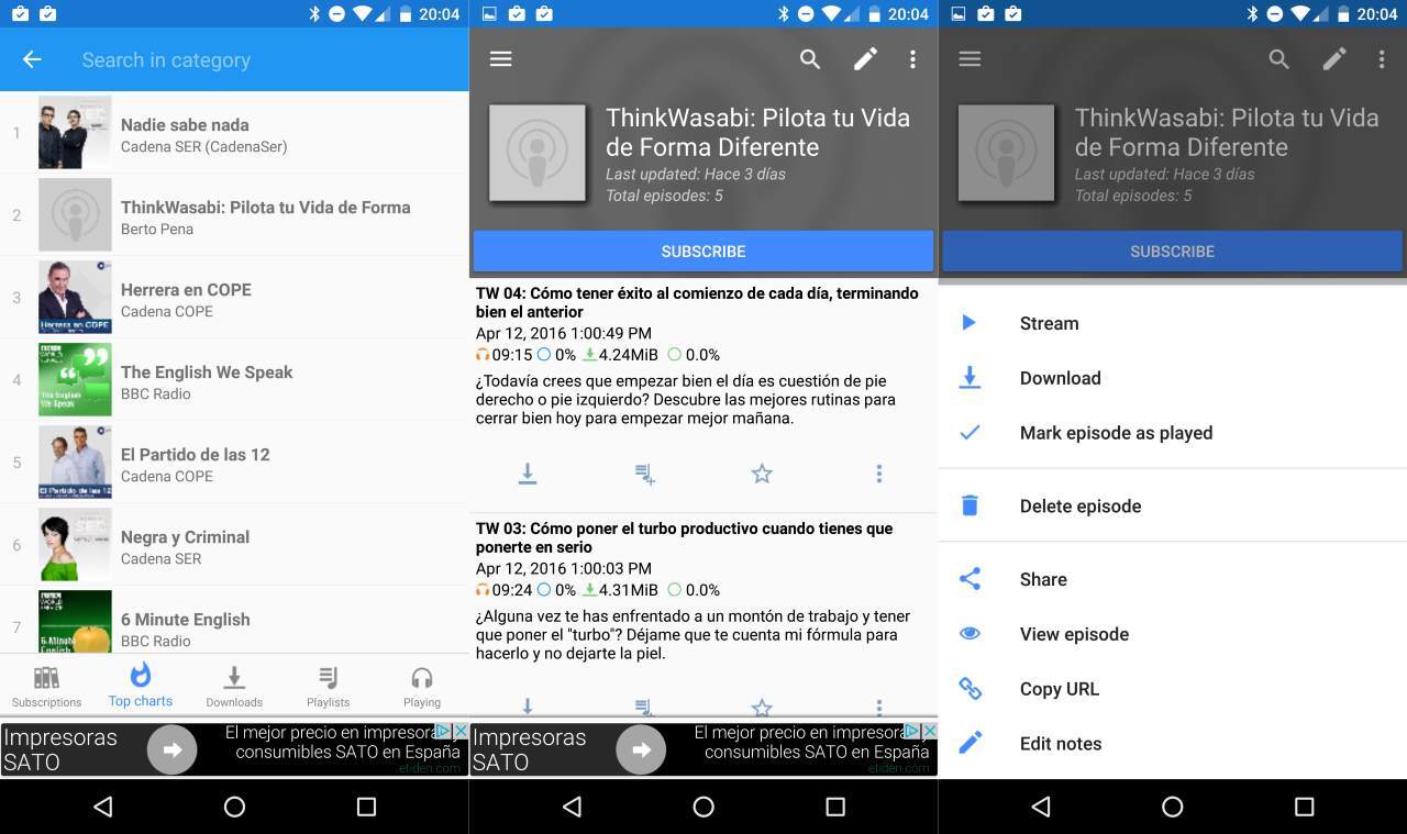 Además de ello, Podcast Republic puede presumir de un modo offline en el que podremos guardar los Podcast directamente en la tarjeta SD, lo que la hace ideal para los fans del almacenamiento ampliable. Además también cuenta con interesantes características como un modo coche, y un widget para la pantalla de bloqueo (que no está disponible para teléfonos con Lollipop o superior).