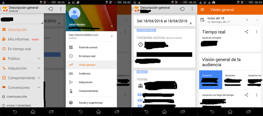 El apartado de «Visión general» presenta ahora un diseño mucho más acorde a la filosofía Material Design de Google. La parte superior de la aplicación está encabezada por una franja de color naranja, y los dos primeros apartados («Tiempo real» y «Visión general de la audiencia») están claramente divididos.