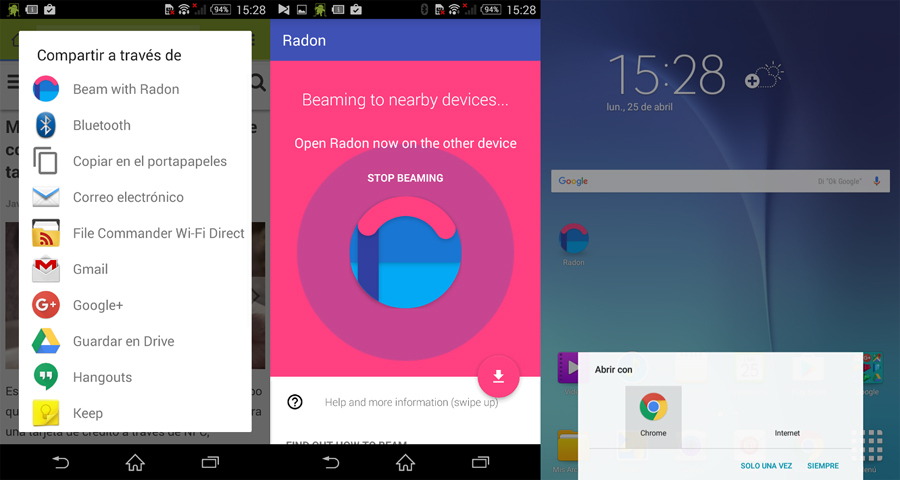 2. Después, desde nuestro dispositivo navegamos hasta el contenido que queremos compartir (podemos empezar probando con una página en Chrome, por ejemplo), pulsamos sobre la opción de «Compartir» que corresponda a la aplicación y, de todas las alternativas que se nos mostrarán, pulsamos sobre «Beam with Radon«.