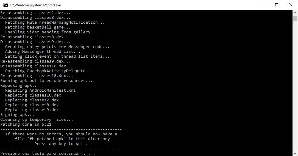 • El programa tardará un rato en parchear la aplicación, y si todo sale bien, aparecerá un archivo apk ‘fb-patched.apk’ que tendremos que instalar en nuestro teléfono.