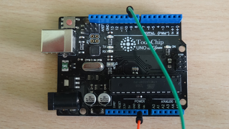 Para ello, el cable que sale de la toma «9» del Arduino tiene que ir a parar al positivo del LED (es decir, a la pata más larga); el cable del «GND», por su parte, va a parar al negativo (es decir, a la pata más corta). Si no estáis seguros de este paso, simplemente realizad la misma conexión que la que se aprecia en la imagen (en nuestro caso el cable verde corresponde a la salida «9», mientras que el rojo es de la salida «GND»).