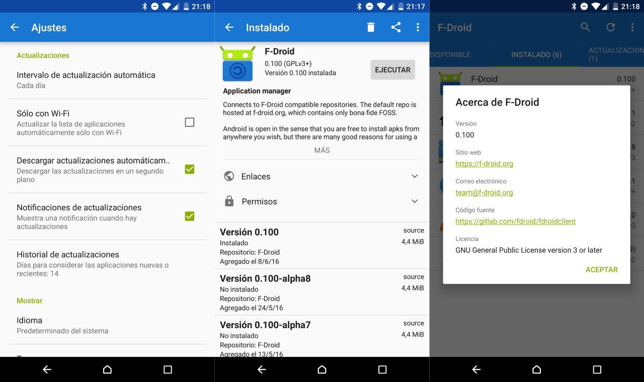 Como es habitual, aquellos que tengáis F-Droid instalado, podéis actualizar la aplicación desde ella misma, mientras que aquellos que no, tendréis que descargar el archivo en formato APK desde la web oficial del proyecto. Cabe destacar que actualmente no funciona en Android N preview, por si alguno que tenga esta versión se le ocurre probarla, no le será posible.