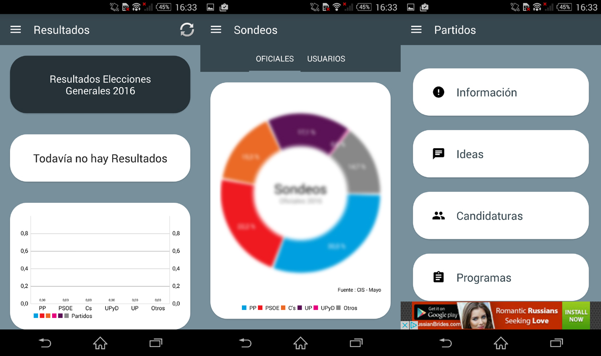 AGE Elecciones 26J una de las aplicaciones más completas en materia de resultados de las votaciones, y personalmente es la que tengo pensado utilizar para estar al tanto de las elecciones. Además del imprescindible apartado de «Resultados», el cual se irá actualizando con el porcentaje escrutado, también tenemos otras secciones en las que podemos conocer noticias, candidaturas o información sobre los partidos.