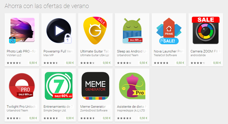 Los de los juegos y las aplicaciones son, sin lugar a dudas, los descuentos más interesantes de la promoción de verano de Google Play. Por una parte tenemos la ya conocida promoción de aplicaciones a 0,50€, la cual incluye títulos tan interesantes como Nova Launcher, Sleep as Android o Twilight, entre otros. Todas estas aplicaciones suelen costar tres, cuatro o hasta cinco euros, y en estas fechas se pueden adquirir a medio euro.