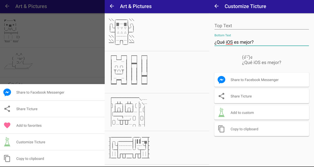 La comunicación a través de mensajería instantánea y redes sociales va mucho más allá de las palabras. Los emojis ya se han convertido en una herramienta fundamental de nuestra comunicación en el día a día. Pero no son los únicos emoticonos que existen. Las caritas felices nacieron como combinaciones de caracteres en texto y a lo largo de los años los usuarios de Internet lograron ideas realmente creativas. Tictures es una aplicación que te permite acceder y personalizar fácilmente tus ¯\_(ツ)_/¯.
